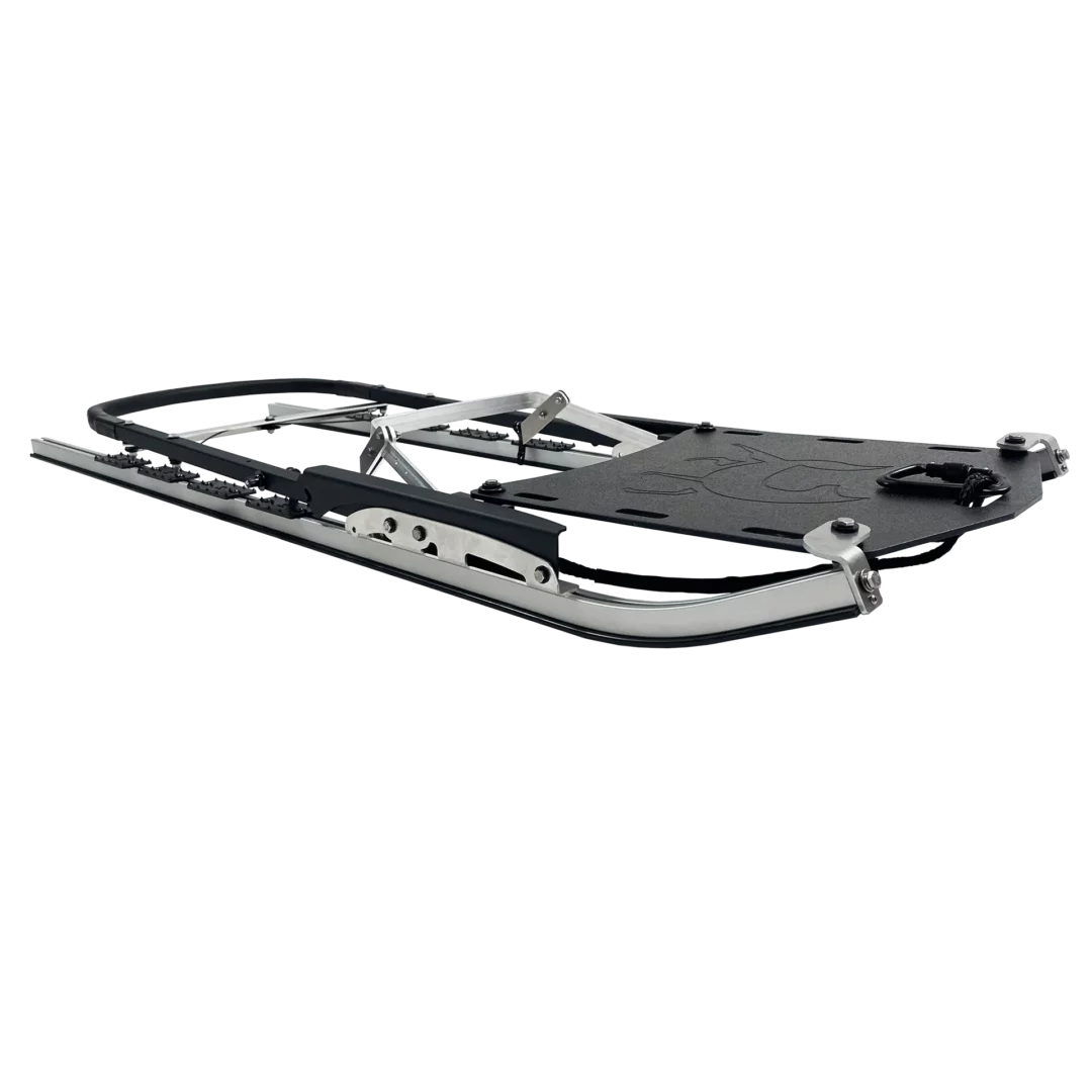 Le modèle de base inclut un mousqueton 5 000 lb à l’avant pour attacher le système de cordage et un frein qui permet d’arrêter la trottinette des neiges très rapidement et de la maintenir en place lorsque vous êtes à l’arrêt et que les chiens veulent repartir.