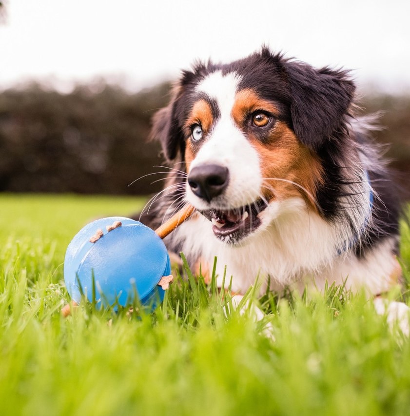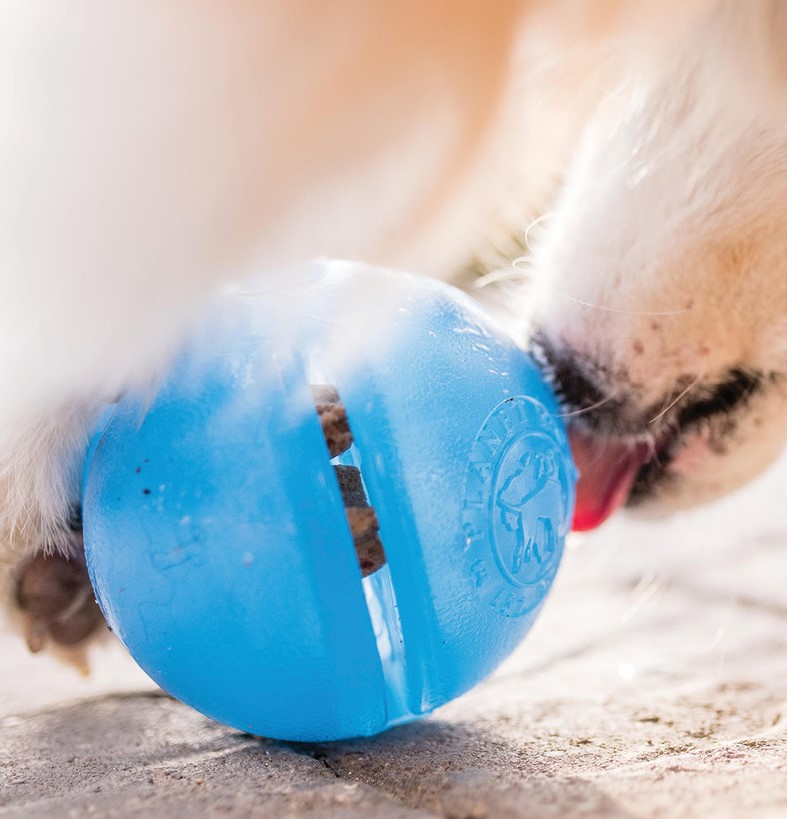 – Balle interactive avec des fentes latérales et un trou central permettant de mettre plusieurs types de gâteries ou bâtons à gruger afin de stimuler votre chien
