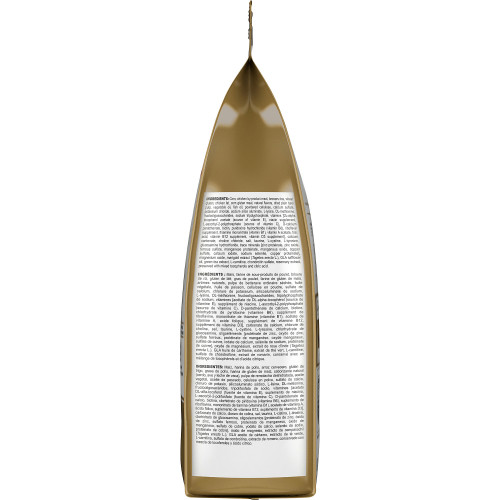 Maïs, brisure de riz, gluten de blé, farine de sous-produits de poulet, gras de poulet, farine de gluten de maïs, arômes naturels, pulpe de betterave ordinaire séchée, huile végétale, huile de poisson, drêche desséchée de distillerie, cellulose en poudre, chlorure de potassium, sulfate de calcium, L-lysine, silicoaluminate de sodium, DL-méthionine, carbonate de calcium, fructooligosaccharides, tripolyphosphate de sodium, sel, taurine, vitamines [acétate de DL-alpha-tocophérol (source de vitamine E), inositol, supplément de niacine, L-ascorbyl- 2-polyphosphate (source de vitamine C), D-pantothénate de calcium, biotine, chlorhydrate de pyridoxine (vitamine B6), supplément de riboflavine, mononitrate de thiamine (vitamine B1), acétate de vitamine A, acide folique, supplément de vitamine B12, supplément de vitamine D3], chlorure de choline, L-cystine, L-tyrosine, extrait de rose d’Inde (Tagetes erecta L.), chlorhydrate de glucosamine, oligoéléments [protéinate de zinc, oxyde de zinc, sulfate de fer, protéinate de manganèse, oxyde manganeux, sulfate de cuivre, iodate de calcium, sélénite de sodium, protéinate de cuivre], thé, L-carnitine, sulfate de chondroïtine, extrait de romarin, conservé avec un mélange de tocophérols et d’acide citrique.