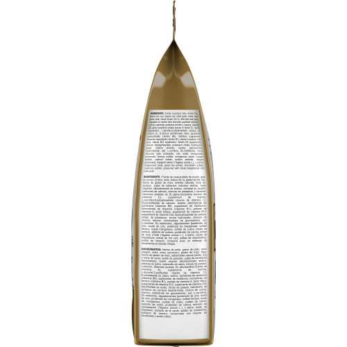 Farine de sous-produits de poulet, riz brun, maïs, graisse de poulet, brisures de riz, gluten de blé, blé, arômes naturels, farine de gluten de maïs, huile de poisson, pulpe de betterave ordinaire séchée, silicoaluminate de sodium, huile végétale, carbonate de calcium, cellulose en poudre, chlorure de potassium, L-tyrosine, tripolyphosphate de sodium, citrate de potassium, taurine, levure hydrolysée, vitamines [acétate de DL-alpha-tocophérol (source de vitamine E), inositol, supplément de niacine, L-ascorbyle-2-polyphosphate (source de vitamine C), pantothénate de D-calcium, biotine, chlorhydrate de pyridoxine (vitamine B6), supplément de riboflavine, mononitrate de thiamine (vitamine B1), acétate de vitamine A, acide folique, supplément de vitamine B12, supplément de vitamine D3], chlorure de choline, chlorhydrate de glucosamine, L-carnitine, L-lysine, DL-méthionine, extrait de rose d’Inde (Tagetes erecta L.), oligoéléments [protéinate de zinc, oxyde de zinc, sulfate ferreux, protéinate de manganèse, oxyde manganeux, sulfate de cuivre, iodate de calcium, sélénite de sodium, protéinate de cuivre], thé, sulfate de chondroïtine, extrait de romarin, conservé avec un mélange de tocophérols et d’acide citrique.